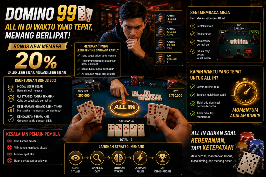 Terutama dalam permainan Domino 99, keputusan untuk “all in” bukanlah aksi nekat tanpa arah. Justru di situlah seni permainan dimulai. Dan bagi pemain baru yang datang dengan bonus new member 20%, momen ini bisa menjadi titik balik—apakah saldo berkembang, atau justru habis dalam hitungan menit.